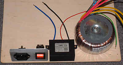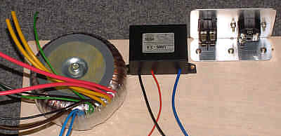 Właściwy montaż zasilacza rozpocząłem od elementów wejściowych zasilacza, czyli transformatora i jego 'otoczenia'. Elementy te pokazane są na schemacie.