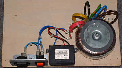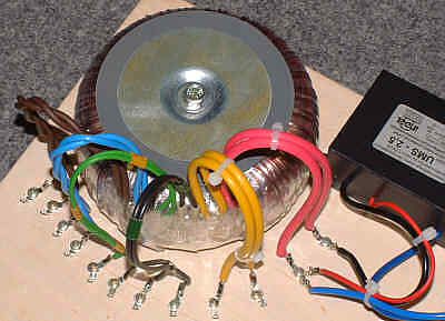 Czas na okablowanie zamocowanych elementów. Po połączeniu wyłącznika i układu miękkiego startu z transformatorem podłączyłem również do oczek lutowniczych wszystkie wyprowadzenia uzwojeń wtórnych transformatora. Ponieważ nie wiadomo jak długie wyprowadzenia uzwojeń będą potrzebne w przyszłości nie przycinałem ich 'pod wymiar' lecz wygiąłem w formie pętli (stąd te gustownie wygięte kolorowe wyprowadzenia).