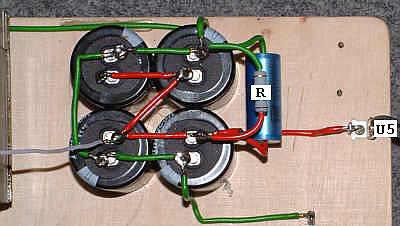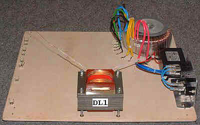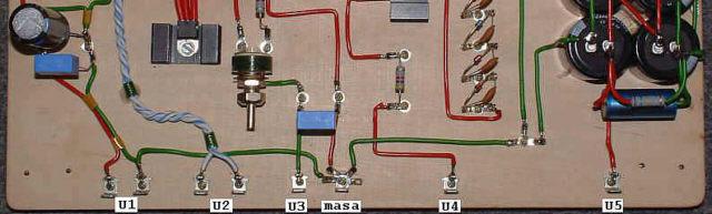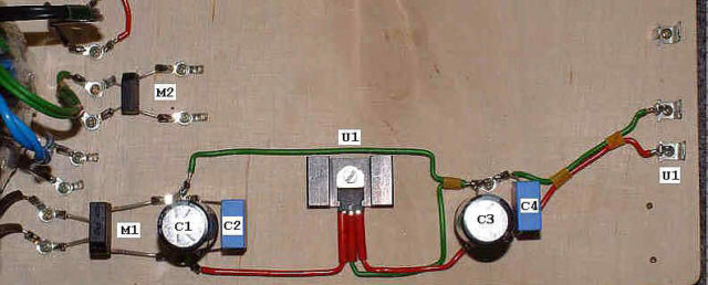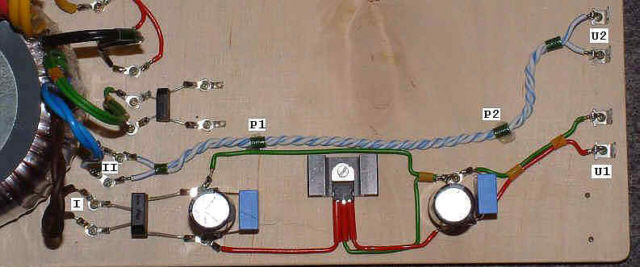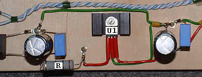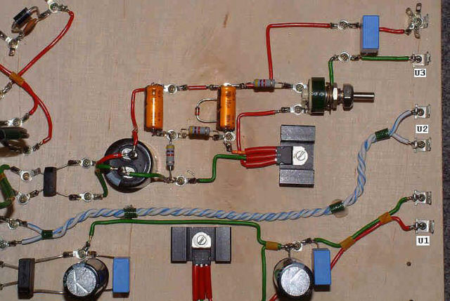 Na fotografii widać wszystkie elementy zasilacza dającego na wyjściu napięcie żarzenia U1. Oznaczenia elementów są zgodne z przedstawionym schematem.