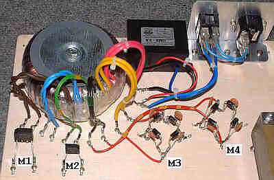 Przed przystąpieniem do montażu poszczególnych sekcji zasilających zamontowałem wszystkie mostki prostownicze. Oznaczone są one zgodnie ze schematem ideowym jako M1, M2, M3 i M4.