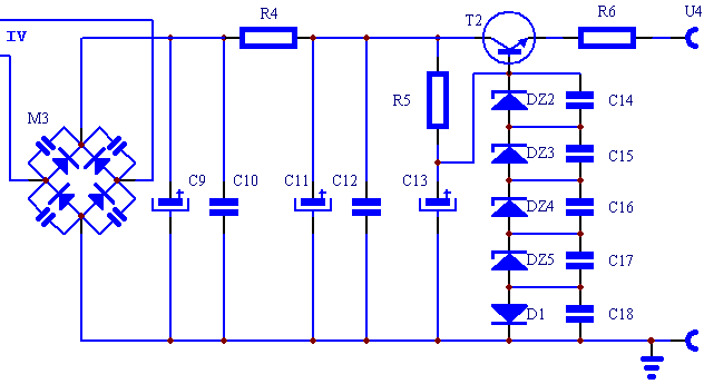 Trzecia sekcja zasilająca to napięcie służące do wstępnej ujemnej polaryzacji siatki lampy 6S33S. Schemat zasilacza pokazany jest na rysunku.