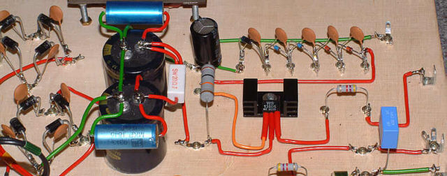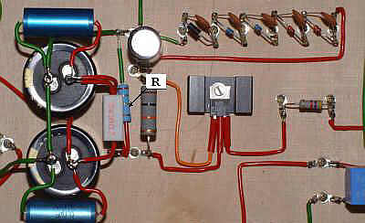 Ponieważ zastosowałem dosyć mały radiator w celu zmniejszenia mocy strat na stabilizatorze żarzenia lampy 6N1P-EW pomiędzy mostek prostowniczy a stabilizator wstawiłem rezystor o wartości 1 oma - na fotografii oznaczony jest on symbolem R.