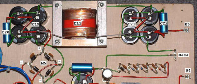 Tak wygląda zasilacz anodowy lampy 6S33S. Kondensatory C19 i C21 zostały złożone z kilku (po 4 na każdą pojemność) elektrolitów połączonych równolegle.