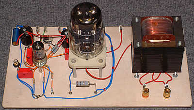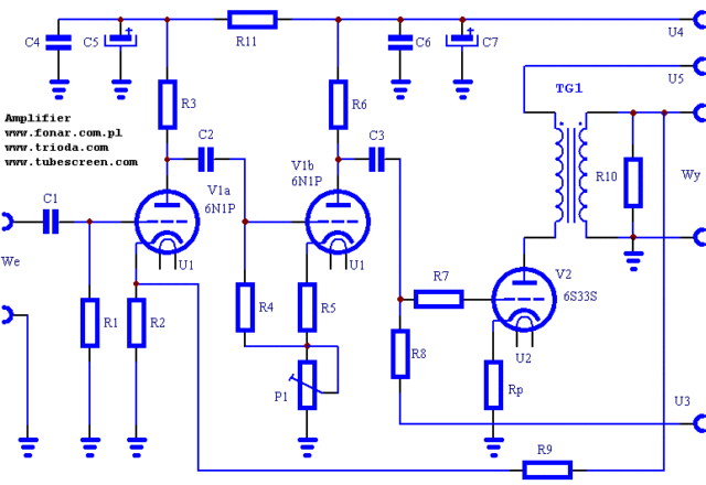 Schemat wzmacniacza pokazany jest na rysunku. Jest to konstrukcja 'minimalistyczna' zawierająca tylko dwie lampy.