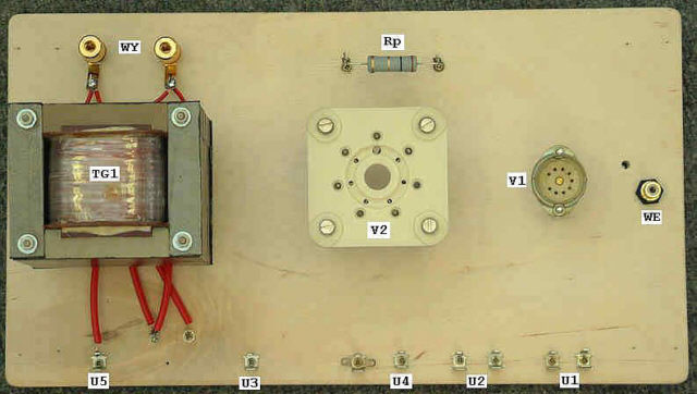 Montaż wzmacniacza najlepiej jest rozpocząć od rozplanowania i zamocowania największych elementów. W tym wypadku jest to transformator głośnikowy [TG1], podstawka pod lampę 6S33S [V2] i podstawka pod lampę 6N1P [V1]. Dodatkowo (jak widać to na poniższej fotografii) na podstawie zamocowałem gniazdko wejściowe [WE], gniazda wyjściowe [WY], rezystor [Rp] służący do pomiaru prądu anodowego lampy 6S33S, oraz końcówki lutownicze, do których podłączone będą napięcia zasilające wzmacniacz [U1], [U2], [U3], [U4] i [U5]
