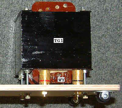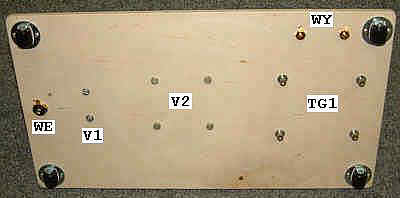 A oto jak przykręcone są do podstawy gniazdka wejściowe [WE] oraz transformator głośnikowy [TG1]
