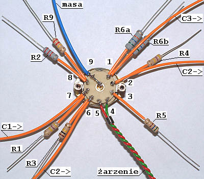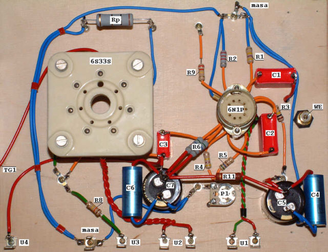 Podobną procedurę zastosowałem w stosunku do lampy 6N1P. Przed przykręceniem do drewnianej płyty nośnej do nóżek podstawki przylutowałem wszystkie elementy oraz przewody połączeniowe. Na fotografii przedstawiony jest widok podstawki od spodu. Oznaczenia elementów są zgodne ze schematem ideowym.