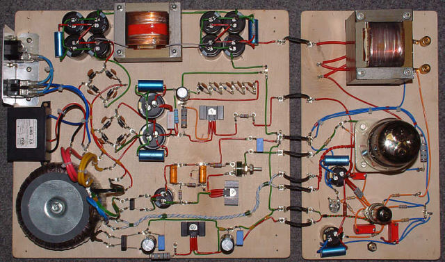 Na forum dyskusyjnym Triody pojawił się wątek dotyczący zbawiennej (z punktu widzenia bezpieczeństwa) roli rezystora bocznikującego kondensatory elektrolityczne w zasilaczach wysokiego napięcia. Wprawdzie o tym wiedziałem, ale potrzebowałem srogiego 'kopnięcia' aby docenić fakt, że napięcie na kondensatorach może być niebezpieczne nawet po dłuższym czasie po wyłączeniu zasilacza. Tak więc zbocznikowałem kondensatory zasilacza napięcia anodowego lampy 6N1P-EW rezystorem 200K (element oznaczony jako R)