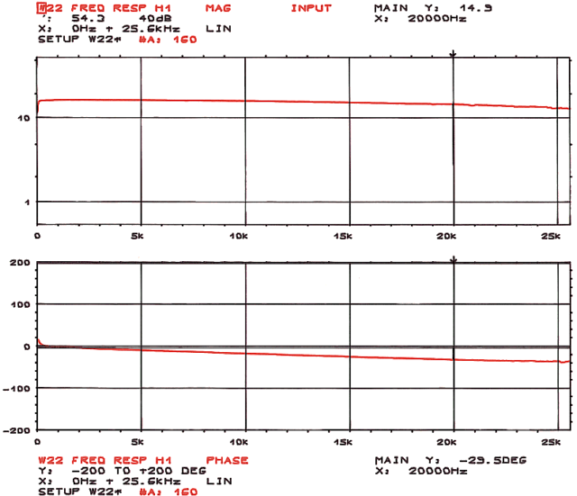 Charakterystyka amplitudowa i fazowa w zakresie częstotliwości 0-25,6kHz. Odczyty dla częstotliwości 20kHz. (wzmacniacz z transformatorem głośnikowym na rdzeniu zwijanym, układ bez korekcji i sprzężenia zwrotnego, sygnał wejściowy - szum biały 10mV, prąd anodowy lampy 6S33S Ia = 155mA)