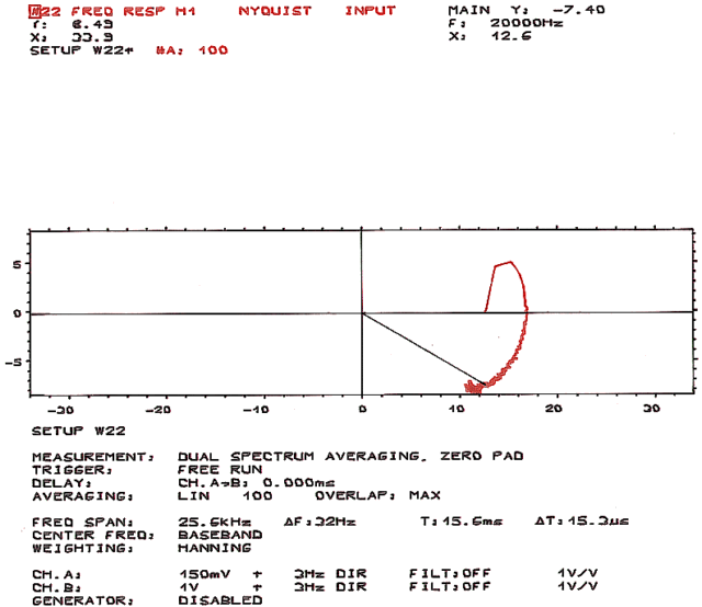 Wykres Nyquista (wzmacniacz z transformatorem głośnikowym na rdzeniu zwijanym, układ bez korekcji i sprzężenia zwrotnego, sygnał wejściowy - szum biały 10mV, prąd anodowy lampy 6S33S Ia = 155mA)