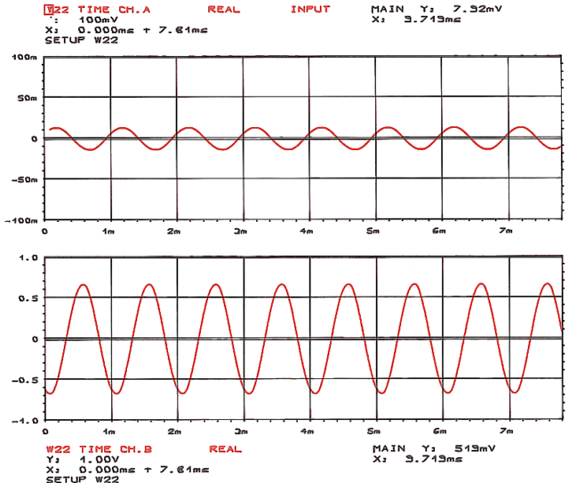 Sygnał na wejściu (wykres górny) i wyjściu (wykres dolny), (wzmacniacz z transformatorem głośnikowym na rdzeniu zwijanym, układ bez korekcji i sprzężenia zwrotnego, sygnał wejściowy sinusoidalny 1kHz, P1 około 10K, prąd anodowy lampy 6S33S Ia = 155mA)
