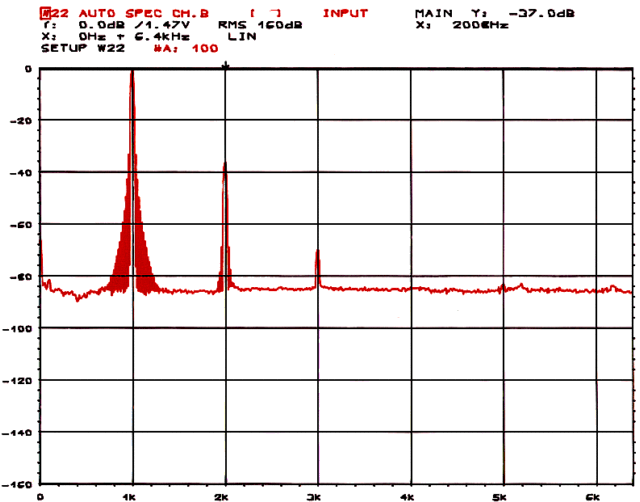 Zniekształcenia harmoniczne (wzmacniacz z transformatorem głośnikowym na rdzeniu zwijanym, układ bez korekcji i sprzężenia zwrotnego, sygnał wejściowy sinusoidalny 1kHz 10mV, sygnał wyjściowy 140mV, P1 około 5K, prąd anodowy lampy 6S33S Ia = 155mA)
