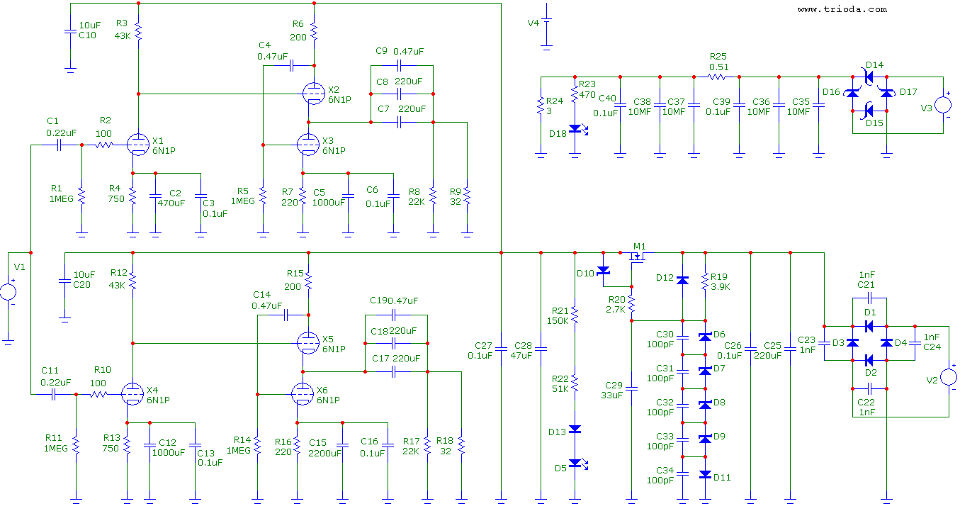 Jak widać, model odwzorowuje pełną strukturę rzeczywistego układu wzmacniacza, w tym jego część zasilającą (zasilacz anodowy i żarzenia) oraz elementy zestawione z kilku części składowych, które można oczywiście zastąpić pojedynczymi elementami o odpowiedniej wartości. Dociekliwi zauważą również, że na schemacie znajduje się nie podłączone źródło napięcia stałego. Wykorzystywałem je jako źródło napięcia anodowego podczas symulacji charakterystyk częstotliwościowych wzmacniacza. Wartość napięcia źródła odpowiada wartości napięcia na wyjściu zasilacza anodowego w stanie ustalonym.