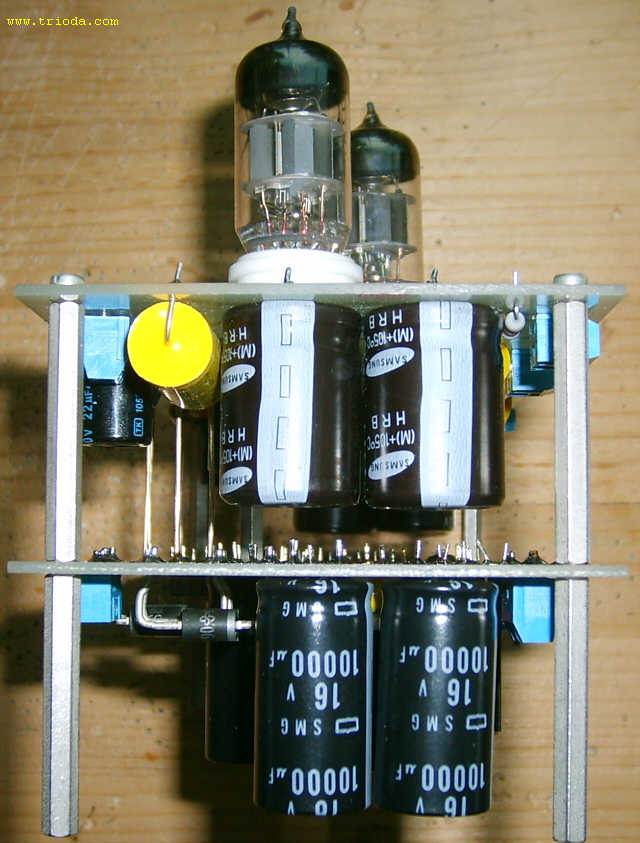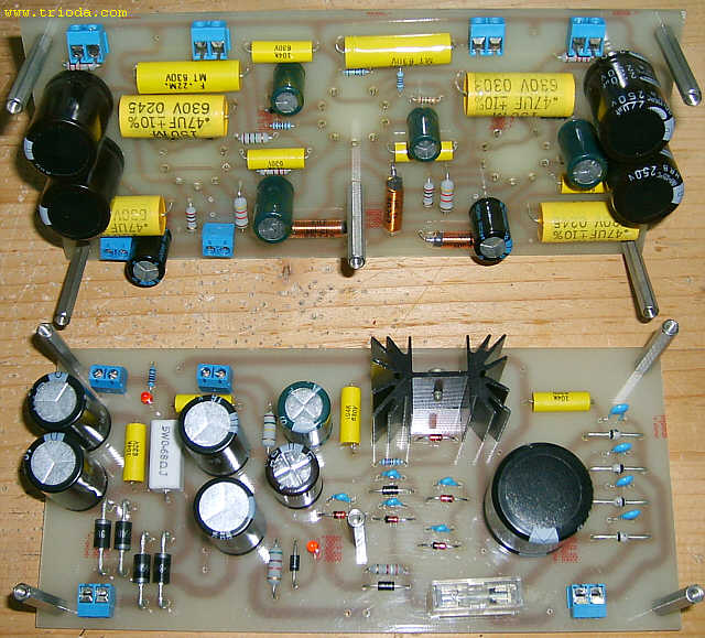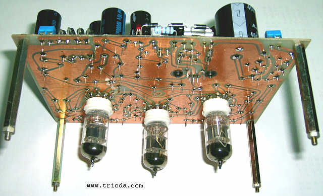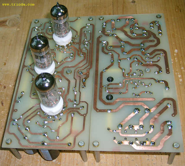 Tutaj widać dokładniej elektryczne połączenie płytki zasilacza i wzmacniacza za pomocą kilku odcinków srebrzanki.