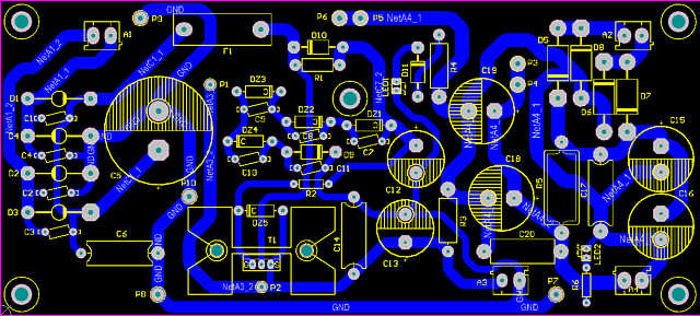 Druga wersja składa się z dwóch płytek drukowanych - na pierwszej umieszczone są elementy części wzmacniającej układu (właściwy wzmacniacz), na drugiej elementy części zasilającej. Oto schematy, które posłużyły mi do zaprojektowania płytek.
