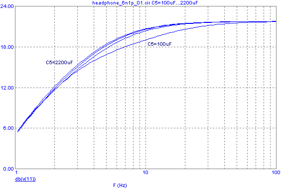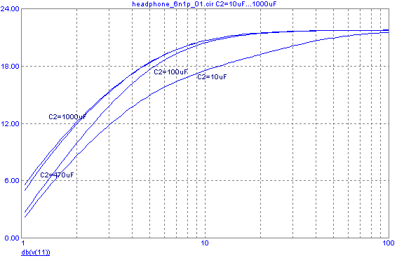 Na Forum TRIODA poruszona była swego czasu kwestia dużych wartości kondensatorów C2/C12 i C5/C15. Ich wpływ na przebieg charakterystyki amplitudowej można zbadać za pomocą pokazanego modelu. Na poniższym rysunku pokazany jest wpływ wartości kondensatora C2 na pasmo przenoszenia w zakresie niskich częstotliwości. Obliczenia wykonano dla wartości zmieniających się od 10uF do 1000uF. Jak widać począwszy od wartości 470uF wpływ zwiększania wartości C2 na przebieg charakterystyki jest pomijalny.