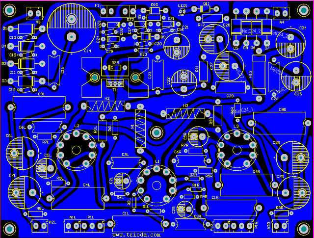 Pierwsza wersja wykorzystuje pojedynczą jednostronną płytkę drukowaną. Proszę mi wierzyć, że zaprojektowanie takiej płytki bez zwor i zapewniającej minimalny poziom zakłóceń podczas pracy wzmacniacza nie był sprawą prostą.