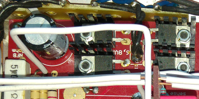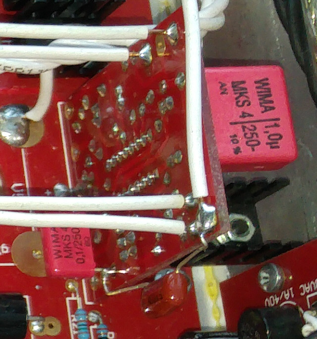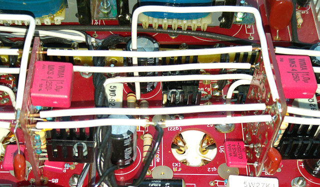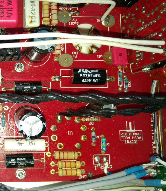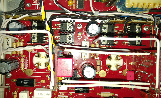 Dwie wlutowane pionowo płytki stabilizacji prądu spoczynkowego lamp końcowych.