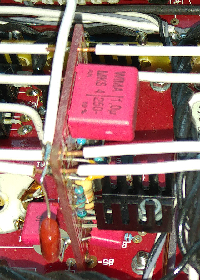 A teraz klika fotografii bardzo szczegółowych. Oto jeden z czterech układów żarzenia lamp 300B prądem stałym. Jak widać diody prostownicze umieszczono na niewielkich radiatorkach.