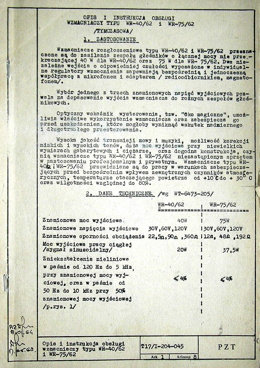Wzmacniacze rozgłoszeniowe WR40/62 i WR75/62 - „Ampli40 i 75” są średniej klasy wzmacniaczami akustycznymi o typowych parametrach elektroakustycznych, wymaganych od urządzeń przeznaczonych do przekazywania audycji słowno-muzycznych i nagłaśniania pomieszczeń.