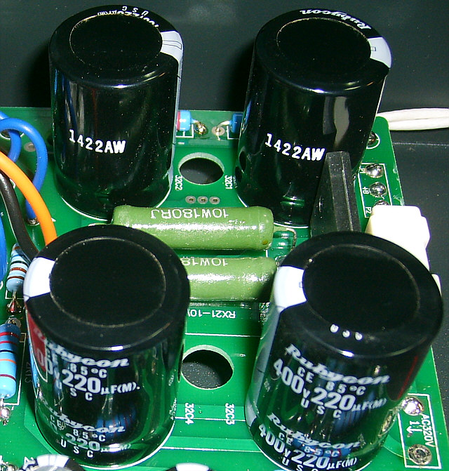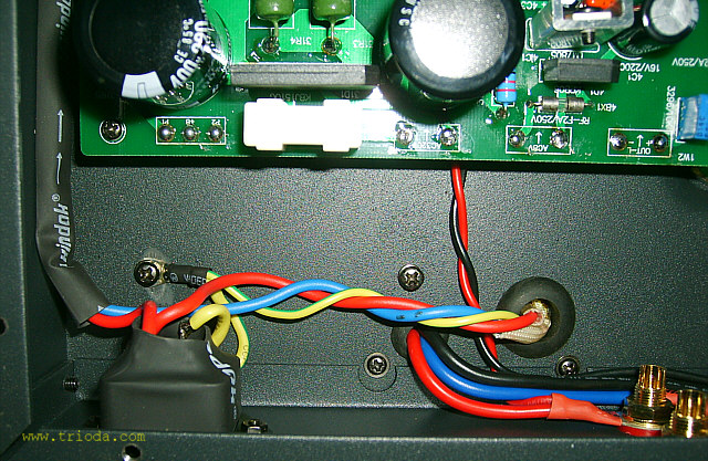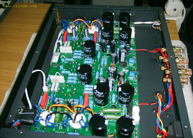 Teraz wracam do początku, czyli fotografii od widoku ogólnego do szczegółów. Raczcie swoje oczy pięknymi widokami, bo jest na co popatrzeć. Wzmacniacz jest naprawdę dobrze wykonany, ma przemyślaną konstrukcję. Znalazłem w nim tylko jedną "niedoróbkę" - zbyt krótkie przewody łączące płytę główną z transformatorami, co utrudnia nieco czynności serwisowe - ale to naprawdę drobiazg.