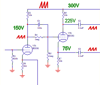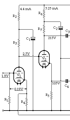 Jeżeli punkt pracy pierwszej lampy ustalimy tak, aby napięcie stałe na anodzie wyniosło połowę napięcia zasilania tego stopnia, to na wyjściu pojawią się tętnienia sieci stłumione o 6dB (połowa amplitudy). Tętnienia przeniosą się przez kondensator C1 na siatkę drugiej lampy i pojawią się w fazie zgodnej na katodzie drugiego stopnia i w fazie przeciwnej na anodzie drugiego stopnia. Ale na anodzie tego stopnia pojawią się również w fazie zgodnej tętnienia przedostające się bezpośrednio z zasilania. Oba przebiegi po zsumowaniu dadzą na anodzie przebieg podobny co do fazy i amplitudy do sygnału na katodzie drugiego stopnia. Powstaje w ten sposób przebieg nie różnicowy, lecz wspólny, który zostanie stłumiony w następnych stopniach wzmacniacza. Układ tłumi oczywiście nie tylko tętnienia, ale wszelkie zakłócenia przedostające się z obwodu zasilania.