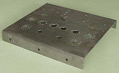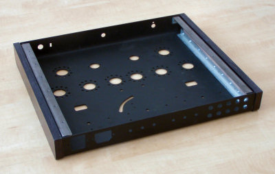 Płyta stalowa o grubości 2mm tworzy zasadnicze chassis o wymiarach 398mm x 360mm i wysokości zaledwie 50mm. Ugięcie blachy nie zostało wykonane dokładnie pod kątem prostym i posiada stosunkowo duży promień, co jednak nie stanowi wady przy założonej konstrukcji obudowy.