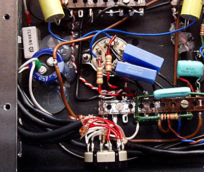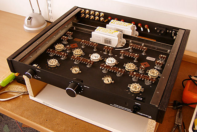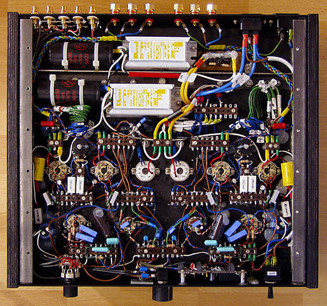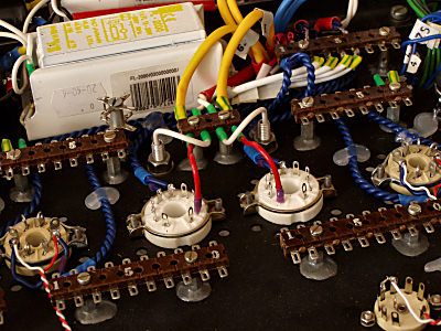 Następnie zamontowałem wszystkie elementy zewnętrzne (podstawki lamp, gniazda i przełączniki) oraz dławiki filtrów zasilania. Na powyższym zdjęciu widać także większość łączówek lutowniczych umożliwiających wygodny montaż przestrzenny elementów elektronicznych. Łączówki wraz z tulejkami dystansowymi zostały przyklejone do obudowy klejem epoksydowym.