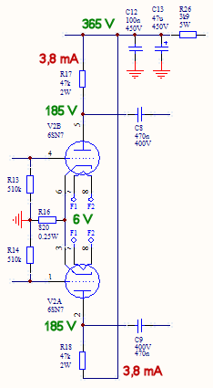 Prąd spoczynkowy i napięcie anodowe obu gałęzi nie są jednakowe ze względu na rozbieżność parametrów obu triod. Ponieważ jest to konfiguracja wzmacniacza różnicowego, nie ma możliwości wyrównania tych prądów bez naruszania symetrii dla składowej zmiennej.