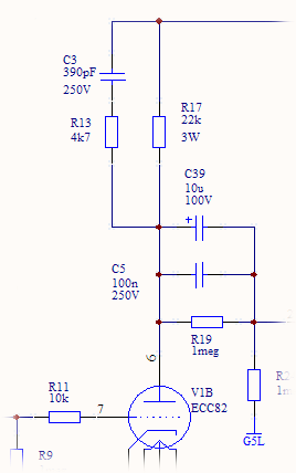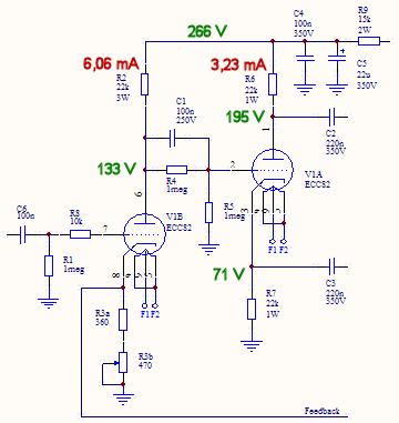 Na ostatnim rysunku pokazany jest układ dwóch pierwszych stopni wzmacniacza Concertino. Potencjometr montażowy w obwodzie katody pierwszego stopnia pozwala zminimalizować różnicowy sygnał tętnień sieci mierzony między wyjściami drugiego stopnia (co powinno nastąpić przy potencjale anody lampy V1B równym połowie napięcia zasilania dwóch pierwszych stopni. Wzmocnienie pierwszego stopnia wynosi około 10 bez zamkniętej pętli sprzężenia zwrotnego i nieco ponad 2 ze sprzężeniem zwrotnym. W dwóch pierwszych stopniach zastosowana jest podwójna trioda ECC82.