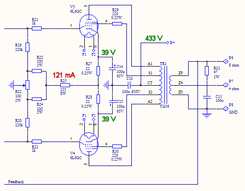 Zastosowany przeze mnie układ polaryzacji lamp stopnia końcowego posiada prosty, ale skuteczny mechanizm symetryzacji prądu spoczynkowego, spotykany zarówno w pierwowzorze Williamsona, jak i w późniejszych konstrukcjach np. firmy Heathkit. Lampy pracują w klasie AB1 (do około 10W w klasie A). Wartością rezystora R25 ustala się prąd spoczynkowy obu lamp (suma prądów katodowych około 120mA, co przy napięciu anodowym rzędu 430V spowoduje wydzielanie w każdej lampie około 23,5W mocy spoczynkowej). Potencjometrem drutowym R32 wyrównuje się prądy spoczynkowe obu lamp (katody powinny posiadać jednakowy potencjał, co jest wystarczającym przybliżeniem warunku jednakowego prądu anodowego lamp). Kondensatory blokujące w obwodzie katody lamp mocy mogą nieznacznie wpływać na poziom zniekształceń stopnia końcowego (w którą stronę – zależy od układu i zastosowanych lamp mocy). W niektórych konstrukcjach kondensatory te są pomijane, jednak w klasie AB muszą zostać użyte.