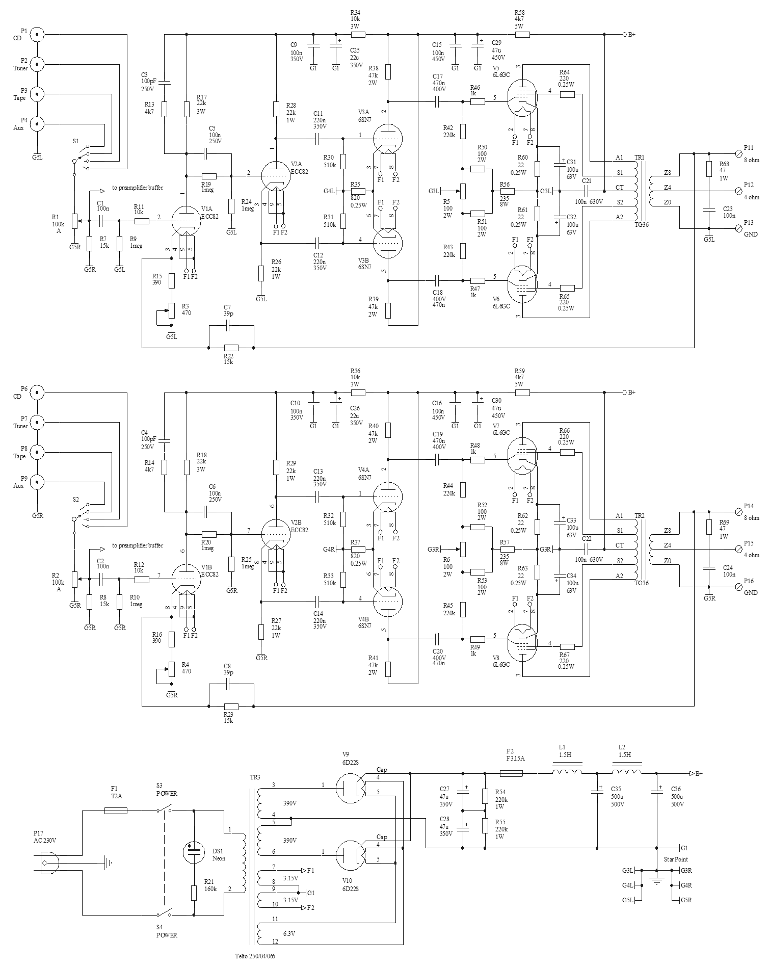 Zastosuję więc prostownik lampowy z filtrem LC. Lampy prostownicze żarzone bezpośrednio nie nadają się – tu także byłby potrzebny układ opóźnionego startu (brak takiego układu był poważną wadą pierwotnego projektu Williamsona). Z lamp pośrednio żarzonych można wybrać np. 5AR4/GZ34. Jedna lampa nie obsłuży jednak obu kanałów – trzeba zastosować dwie, aby dopuszczalne parametry pracy nie zostały przekroczone (270mA średniego poboru prądu i około 1A poboru szczytowego).