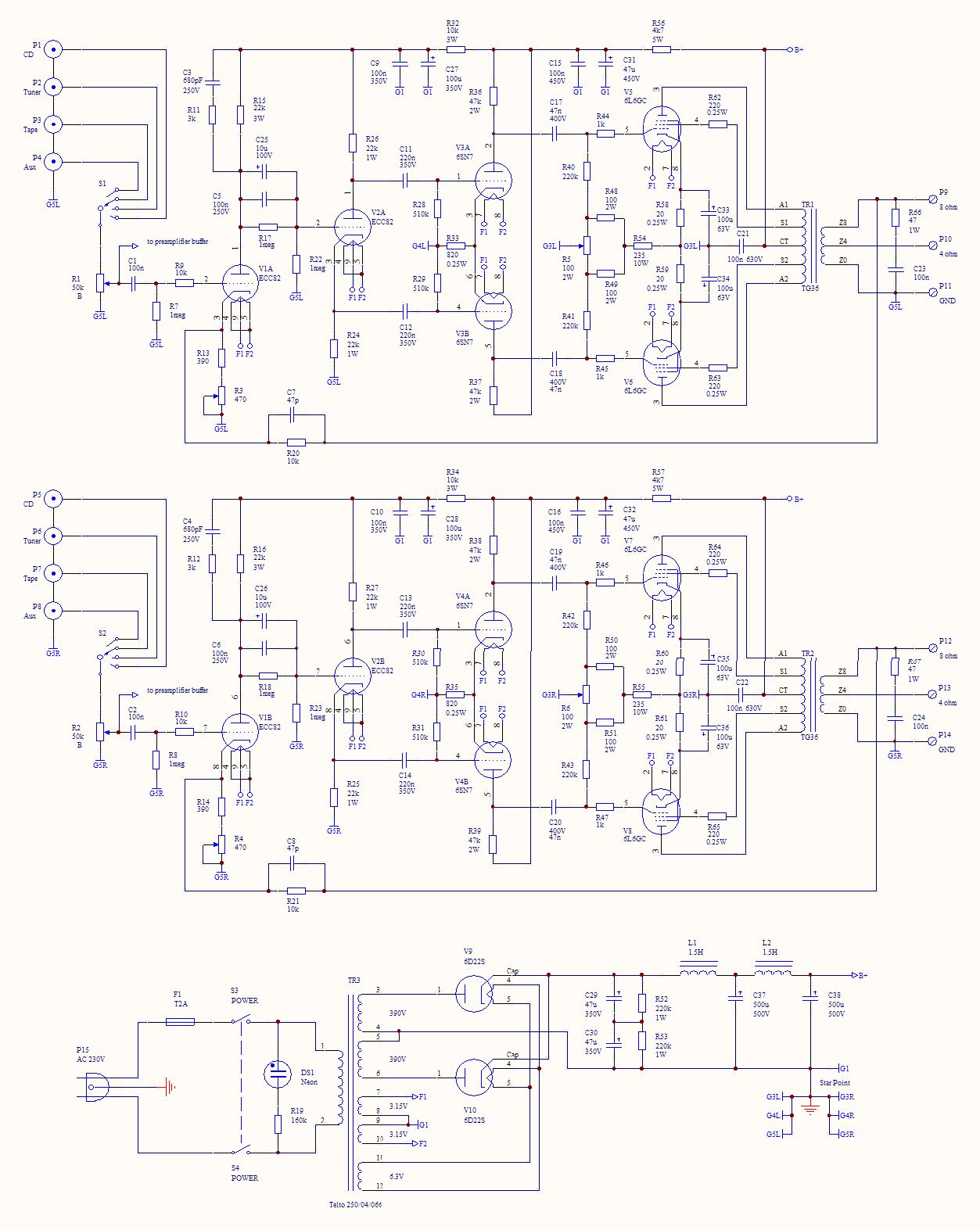 Projekt poleżał sobie kilka kolejnych miesięcy, w czasie których powoli przekonywałem się, że udany wzmacniacz mocy nie musi wcale posiadać triod w stopniu końcowym. Zacząłem rozważać wykorzystanie tetrod strumieniowych w układzie ultraliniowym. Układ taki łączy zalety brzmienia triod (niski poziom zniekształceń) z wysoką efektywnością i stabilnością tetrod i pentod. Do wyboru miałem lampy 6L6/5881, KT66, KT88/6550, powszechnie stosowane zarówno we wzmacniaczach gitarowych, jak i w konstrukcjach Hi-Fi.