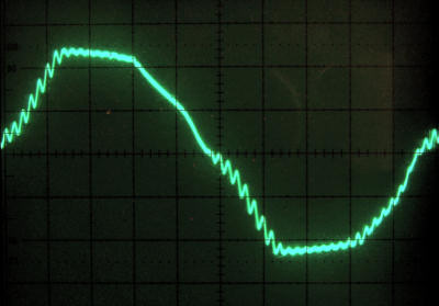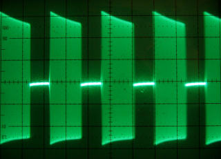 Efekt silnego przesterowania wzmacniacza przy przebiegu wejściowym jak na zdjęciu powyżej. Wzmacniacz wykazuje oznaki zatykania na czas nie dłuższy od połowy okresu przebiegu. Poziom wejściowy wynosi 145% maksymalnej wartości nie powodującej przesterowania wzmacniacza.