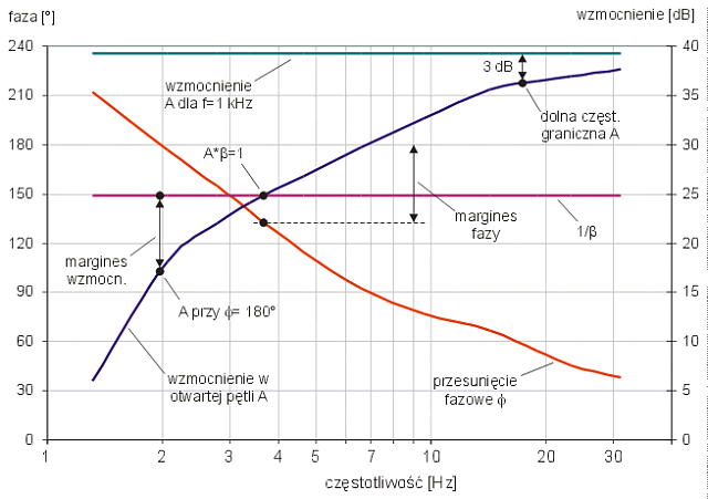Nieco powyżej częstotliwości drugiego bieguna (około 90kHz) leży punkt, dla którego wzmocnienie pętli A*b=1. Przesunięcie fazowe w tym punkcie osiąga wartość około 130°. Margines fazy o wartości 50° powinien zapewnić bezwarunkową stabilność wzmacniacza.
