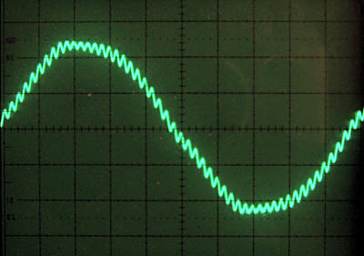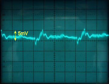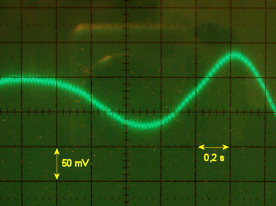 Po dołączeniu głośnika dało się usłyszeć niewielki przydźwięk sieciowy. Pomiar sygnału na wyjściu wzmacniacza dał wartość 0,8mVrms przy częstotliwości podstawowej 100Hz. Na zdjęciu zamieszczonym po prawej widoczny jest przebieg na wyjściu transformatora.