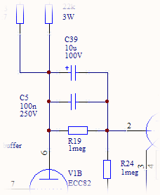 Bufor przedwzmacniacza pełni dodatkową rolę, nie związaną z właściwym układem wzmacniacza lampowego, i dlatego nie został zamieszczony na głównym schemacie. Zadaniem bufora jest separacja regulowanego wyjścia sygnału przeznaczonego dla zewnętrznego subwoofera od obwodu wejściowego pierwszej lampy wzmacniacza. Jest to jedyny fragment układu zawierający elementy półprzewodnikowe (i choć nie widzę nic złego w ich stosowaniu, zasadniczy układ wzmacniacza pozostaje od nich wolny, by maksymalnie przypominał obwody stosowane pół wieku temu).