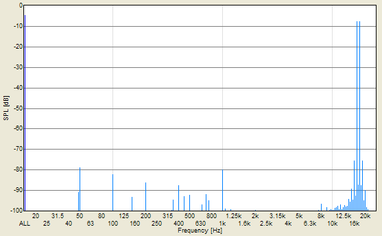 Widmo zniekształceń intermodulacyjnych (f1=17kHz, f2=18 kHz).