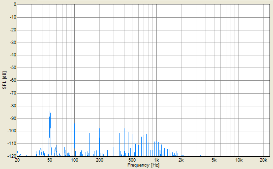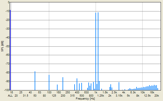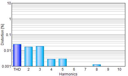 Rozkład harmonicznych na wyjściu wzmacniacza dla sygnału sinusoidalnego f=1kHz, P=1W. Współczynnik zawartości harmonicznych THD=0.025%.
