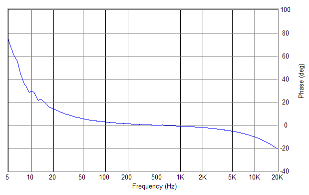 Na powyższym rysunku przedstawiona jest charakterystyka amplitudowa i fazowa wzmacniacza Concertino w otwartej pętli (dla częstotliwości < 30Hz). Przy zastosowaniu globalnego sprzężenia zwrotnego o głębokości 16dB otrzymałem około 45° marginesu fazy i 8dB marginesu wzmocnienia.
