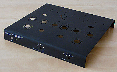 Postanowiłem wykonać obudowę przedstawioną schematycznie na rysunku. Podstawowe chassis składać się będzie z giętej blachy stalowej o grubości 2mm. Zagięcia utworzą panel czołowy i tylny. Boki wykonane zostaną z lakierowanego drewna i przymocowane na stałe do blachy. Dostęp do wnętrza obudowy umożliwi przykręcane dno – płyta stalowa o grubości 1mm. Lampy i transformatory toroidalne umieszczone zostaną na górze urządzenia i wymagać będą dodatkowych elementów ochronnych i maskujących. Pozostałe elementy zamontowane zostaną we wnętrzu obudowy.