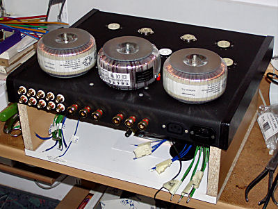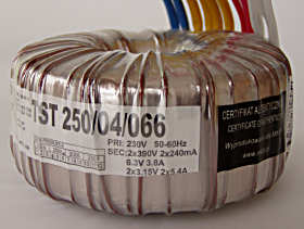 Transformator sieciowy został wykonany na zamówienie przez firmę MKPT (wykonanie Telto). Jest to toroid 250VA dający na wyjściu 2*390V dla obwodów anodowych, 6,3V dla żarzenia lamp 6D22S i 2*3,15V dla żarzenia pozostałych lamp (odczep środkowy na potencjale masy dla zminimalizowania przydźwięku sieci). Jeśli moje szacunki są prawidłowe powinienem otrzymać pod obciążeniem napięcie anodowe około 430V.