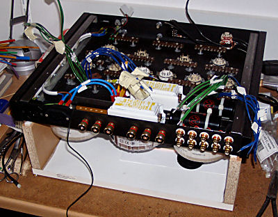 W ostatnim etapie został zmontowany i uruchomiony stopień napięciowy i rozdzielacz fazy. U góry zdjęcia widać potencjometr regulacji prądu spoczynkowego pierwszej triody (dla uzyskania napięcia anodowego wynoszącego dokładnie połowę wartości napięcia zasilania pierwszego stopnia).