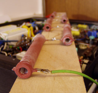 Tymczasowe obciążenie zasilacza stanowiło 5 trzydziestowatowych rezystorów o łącznym oporze 1800Ω. W czasie testu powinno wydzielić się na nich ponad 100W mocy.
