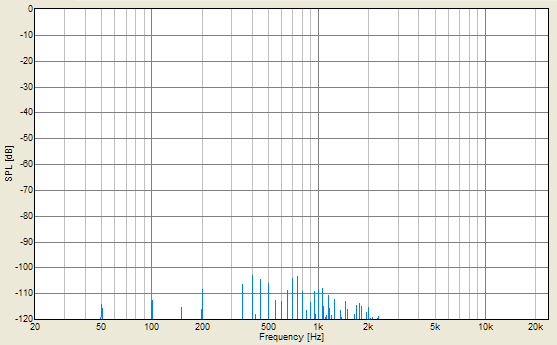 Widmo zniekształceń intermodulacyjnych (f1=1kHz, f2=1.1kHz).