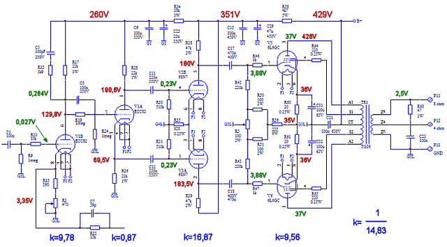 W wielu spotykanych schematach wartość rezystora katodowego R16 jest zbyt niska (np. 220Ω lub 390Ω), co niekorzystnie ustala punkt pracy lampy (Ugk=-2÷-3V). Ponieważ stopień sterujący musi być zdolny dostarczyć lampom mocy napięcia około 70Vpp, napięcie na siatce lamp 6SN7 będzie się zmieniać o ponad 4Vpp. Aby siatka tych lamp nie wchodziła w zakres dodatnich napięć, bezpieczniej jest ustalić Ugk=-4V lub mniejsze.