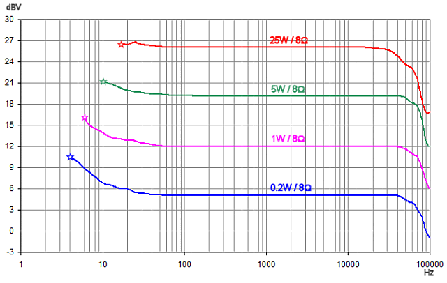Pasmo mocy mierzone dla 4 różnych poziomów. Gwiazdka na wykresie oznacza punkt, w którym gwałtownie wzrasta poziom zniekształceń wynikający z nasycenia transformatora wyjściowego.