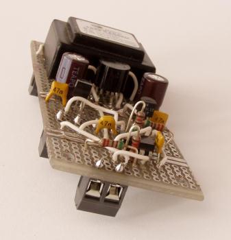 Układ zasilany jest z dodatkowego małego transformatora sieciowego o napięciu wtórnym 2 x 12 V. Ponieważ układ posiada zaledwie kilka elementów, zmontowany został na kawałku płytki uniwersalnej.