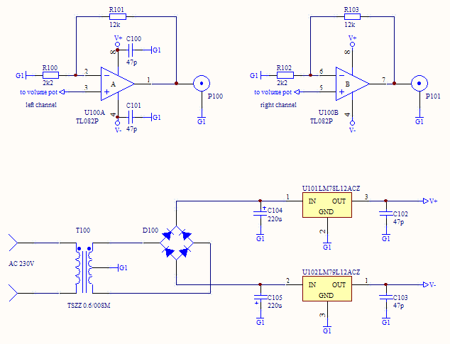 Sygnał wejściowy ze ślizgacza potencjometru głośności trafia również do układu bufora. Układ ten nie jest pokazany na schemacie, ponieważ pełni rolę pomocniczą (wyprowadzenie sygnału dla aktywnego subwoofera).