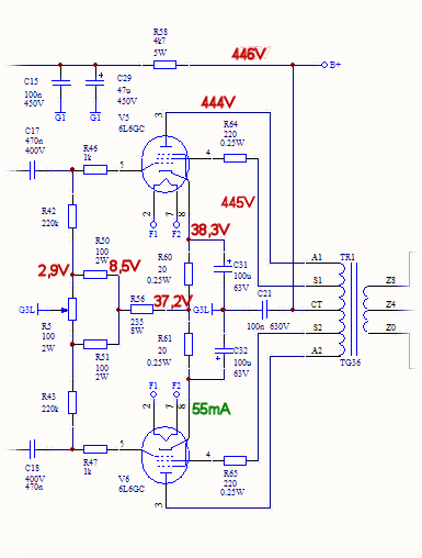 Wartość rezystora R56 dobiera się dla uzyskania odpowiedniego prądu spoczynkowego lamp mocy. Odpowiednie okazały się dwa połączone równolegle rezystory 470Ω (prąd katody każdej lampy około 57mA).